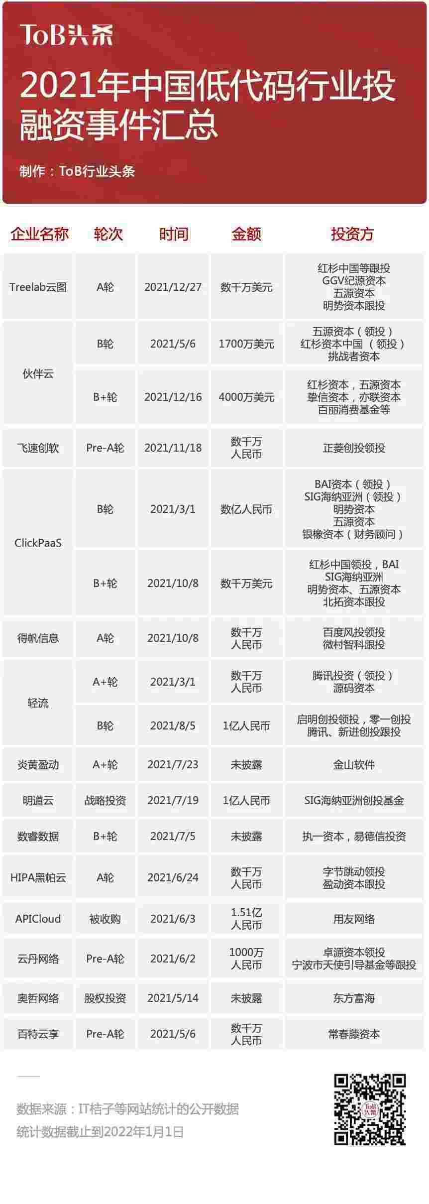 到2021年,,,无/低代码投融资规模势头更甚,,,其中包括轻流两轮融资(A+轮数千万人民币,,,,B轮近亿人民币)、、、、NO钱包 两轮融资(B轮数亿人民币,,B+轮数千万美元)、、、百特云享数千万元Pre-A轮融资......
